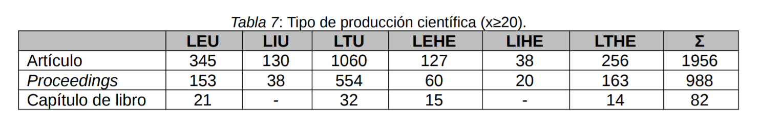 En cuanto a la productividad de fuente, y más concretamente, respecto al tipo de producción, son los artículos, comunicaciones y/o ponencias en congresos y los capítulos de libro (Tabla 7) los más usuales al respecto. No obstante, es el primer grupo (65,7%) el que conforma el grueso de la producción analizada sobre este campo.