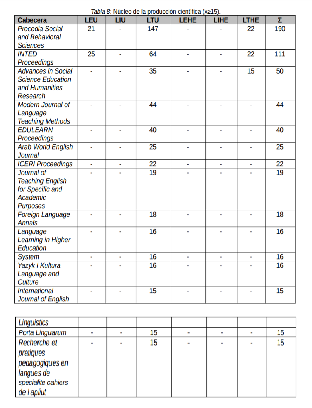 Por lo que corresponde al núcleo de la producción científica (Tabla 8), es decir, la fuente de los textos científicos que mayor suma de obras concentra, los análisis realizados determinan que la colección: Procedia Social and Behavioral Sciences (6,4%), INTED Proceedings (3,8%), ambas publicaciones resultantes de reuniones científicas, centralizan el mayor número de referencias (10,2%). A su vez, destacan las revistas: Advances in Social Science Education and Humanities Research (1,5%) y Modern Journal of Language Teaching Methods (1,3%).