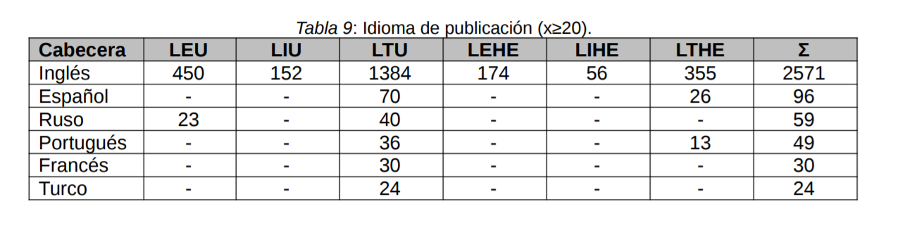 El grueso de la investigación científica se escribe y publica en inglés (86,33%), tanto en la globalidad de los resultados, como en las seis búsquedas aisladas realizadas (Tabla 9). De este modo, el idioma de Shakespeare es el preferido para difundir el conocimiento sobre la enseñanza de lenguas.