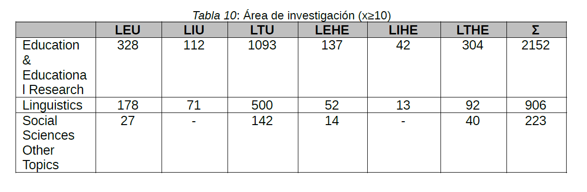 La investigación analizada proviene mayormente de tres áreas de investigación: educación, lingüística y otros tópicos relacionados con las Ciencias Sociales (Tabla 10). No obstante, la primera de ellas es la que concentra la mayor cuantía de referencias (72,26%), tanto en la globalidad de los resultados como en las seis búsquedas combinadas.