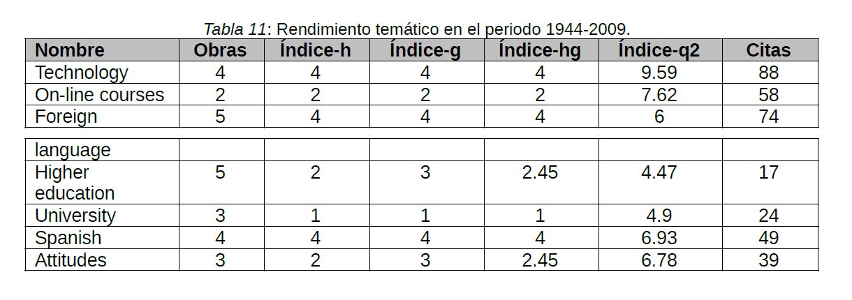 Iniciando el análisis de los temas de investigación en los distintos periodos, se observa que en el primero, de 1944 hasta 1999, los temas con mayor índice son TECHNOLOGY, FOREIGN LANGUAGE y SPANISH (tabla 11).