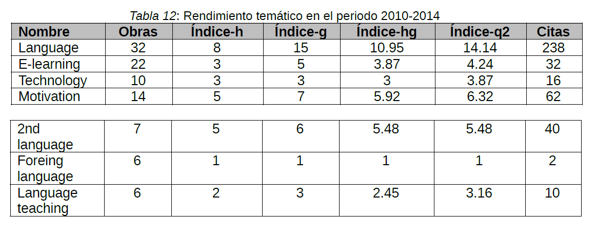 En el segundo periodo, comprendido entre los años 2010 y 2014, ambos inclusive, el tema con mayor índice es LANGUAGE (Tabla 12).