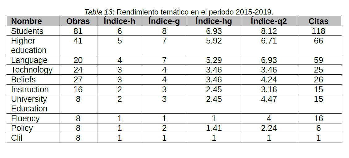 En el último y tercer periodo, comprendido entre los años 2015 y 2019, los temas con mayor índice son STUDENTS, HIGHER EDUCATION y LANGUAGE (Tabla 13).