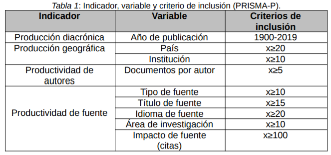 Para la evaluación de rendimiento y de producción científica se desarrolló un estudio descriptivo, mediante el establecimiento de 9 variables, al que se le aplicó una matriz de protocolo PRISMA-P (HUTTO; CATALÁ; MOHER, 2016) y cuyos criterios de inclusión podemos ver en la Tabla 1.