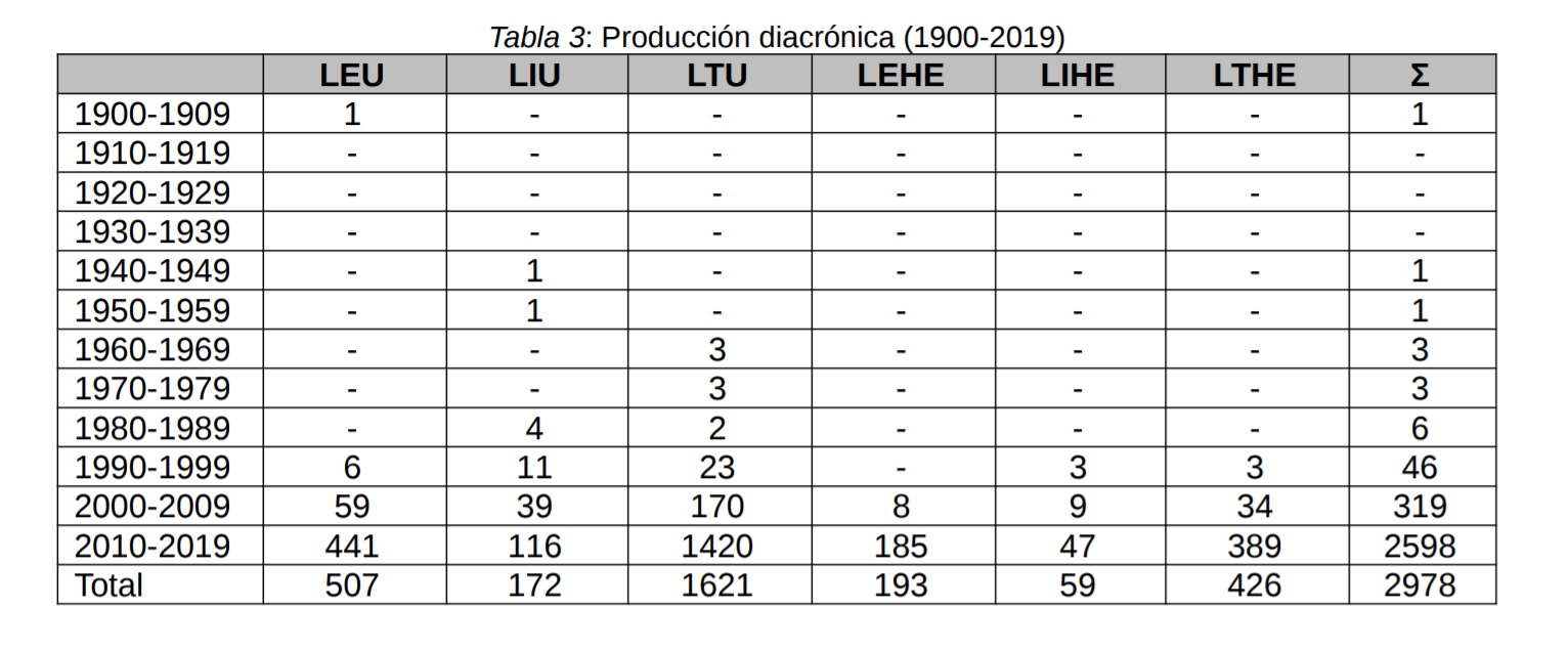 Se ha llevado a cabo un análisis cuantitativo de una muestra n=2978 referencias (artículos, libros, capítulos de libro, proceedings, revisiones, etc.) siendo la mayoría de ellas provenientes de la búsqueda combinada LTU (54,43%). Por otro lado, tal y como podemos observar en la siguiente tabla, el análisis de la producción diacrónica determina que es en la última década (2010-2019) donde tiene cabida la mayor producción científica al respecto (87,2%), por lo que nos encontramos ante un tema en fase de crecimiento exponencial y de gran relevancia.