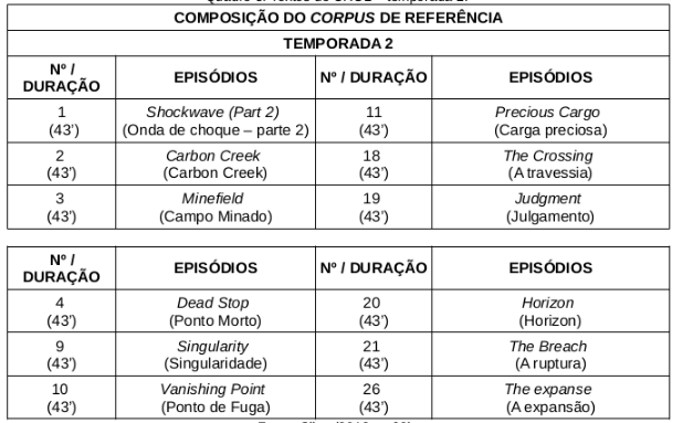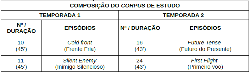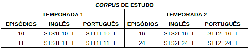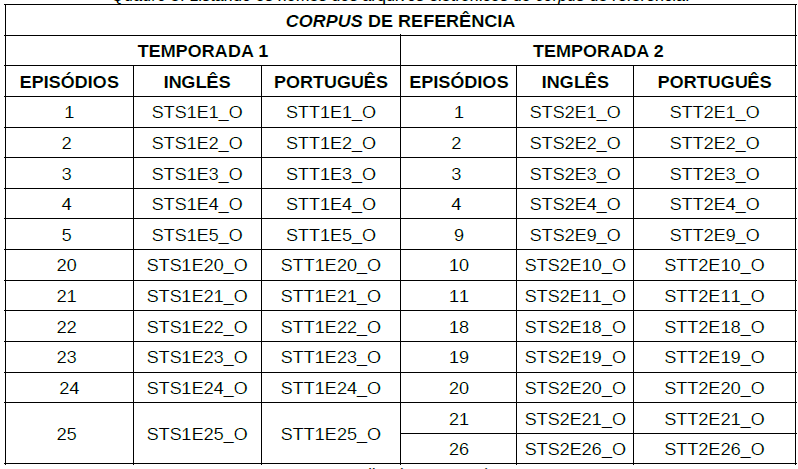 A seguir, nos Quadros 1, 2 e 3, são apresentados os textos que fizeram parte dos corpora acima elencados. É relevante ressaltar que os títulos dos episódios em português são de autoria da Netflix.