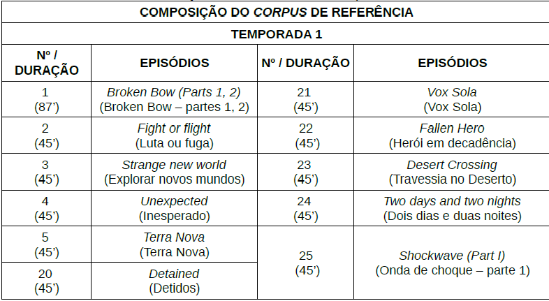 Este artigo tem o objetivo de descrever o passo a passo metodológico da criação de corpora de legendas que, na pesquisa de Silva (2018), foram produzidas para a série de TV Star Trek: Enterprise. Esse percurso metodológico pode servir como possível modelo para futuras pesquisas que façam uso de corpus/corpora de legendas. No presente texto, entende-se corpus (singular da palavra corpora) como uma coleção de textos em formato eletrônico, que são passíveis de análises automáticas e/ou semiautomáticas (BAKER, 1996). Sendo assim, foram criados corpora de estudo e de referência, em inglês e português, que serviram, na prática, para realização de pesquisa de mestrado do autor do presente artigo (SILVA, 2018), defendida em julho de 2018, no Programa de Pós-Graduação em Estudos da Tradução, na Universidade de Brasília, e financiada pela Capes.