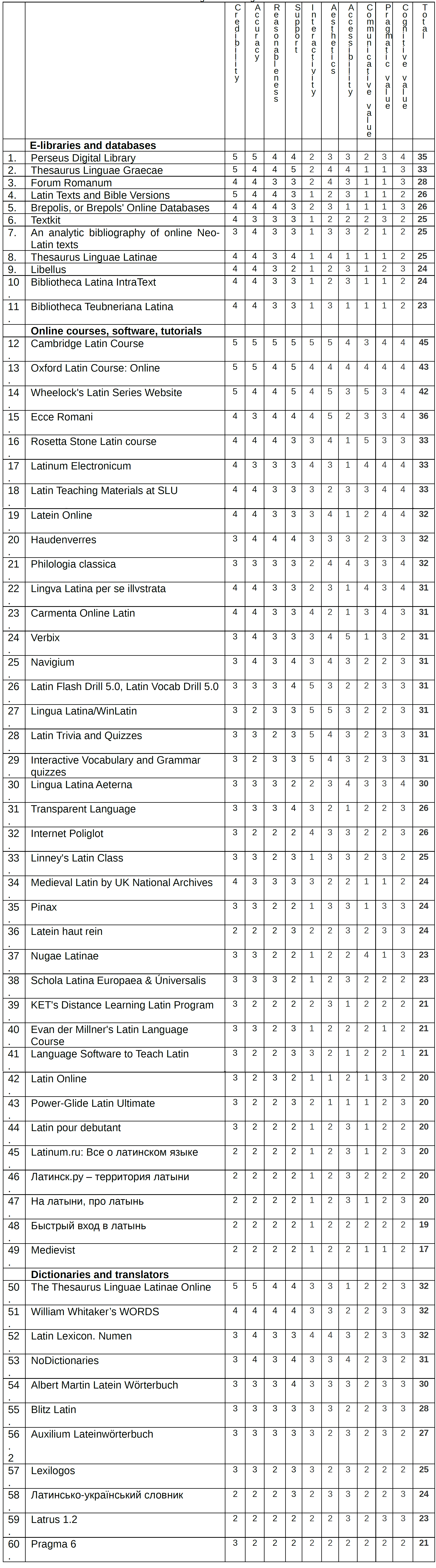Since there are no unified criteria for evaluating resources for teaching and learning Latin, in selecting resources we have been guided by criteria, which were developed based on CARS checklist for evaluating Internet research sources (HARRIS, 1997), Adaptable usability heuristic checklist for online courses (DRINGUS; COHEN, 2005), and Criteria for selection of educational materials used in foreign language teaching (KORSAKOVA, 2014).