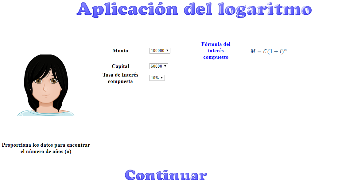 La página de inicio en la AEL solicita la información sobre el monto, el capital y la tasa de interés para iniciar el procedimiento sobre el uso del logaritmo en el campo de las matemáticas financieras (Ver Figura 1).