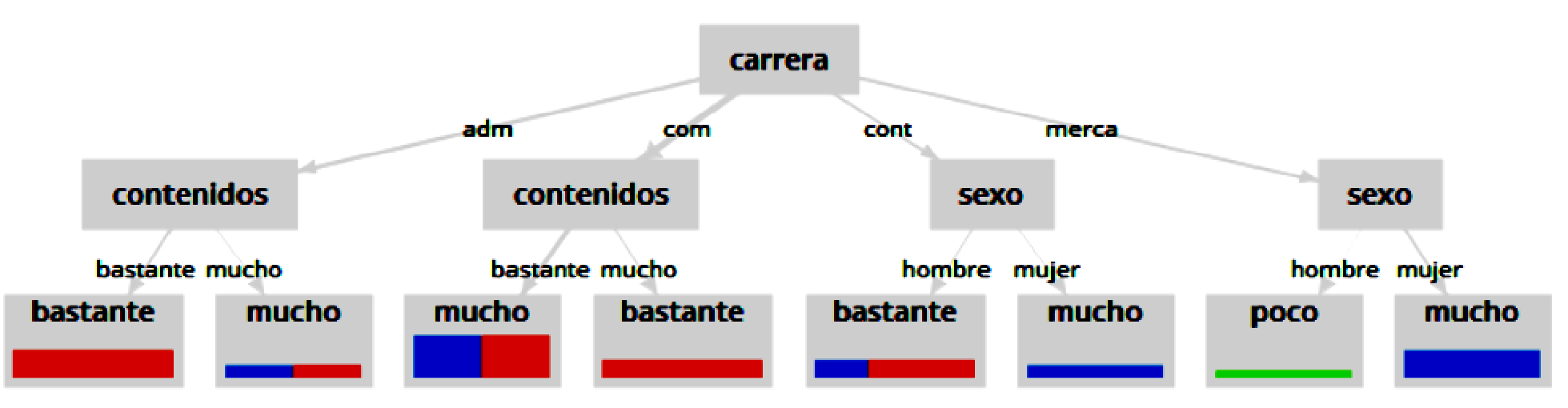 La Figura 3 muestra el modelo predictivo 1 sobre el uso de la AEL en el contexto educativo con la exactitud de 79.31%. Por ejemplo, si el estudiante cursa la carrera de Administración y considera que los contenidos de la AEL facilitan bastante el proceso de aprendizaje entonces el uso de la AEL en las actividades escolares facilita bastante la asimilación del conocimiento sobre el logaritmo.