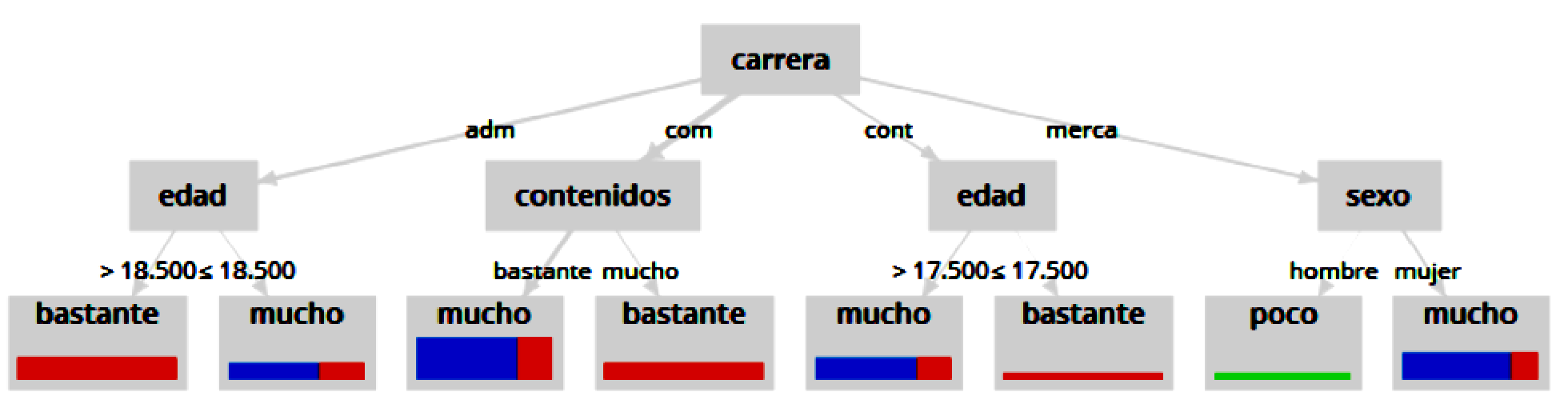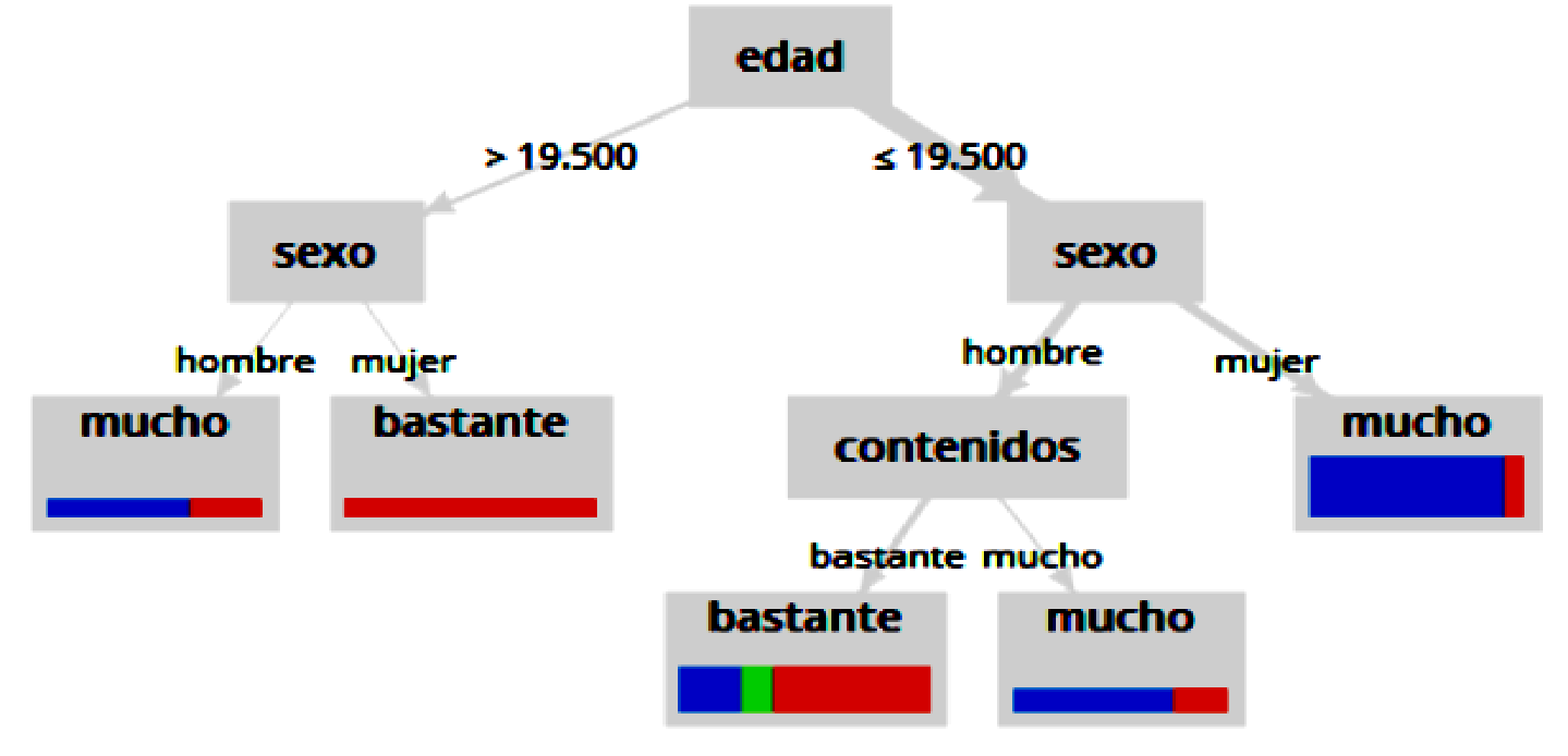 Por otro lado, la ciencia de datos utiliza la información sobre el perfil del estudiante (edad, sexo y carrera) y el uso de la AEL en el proceso de enseñanza-aprendizaje para construir los modelos predictivos por medio de la técnica árbol de decisión.