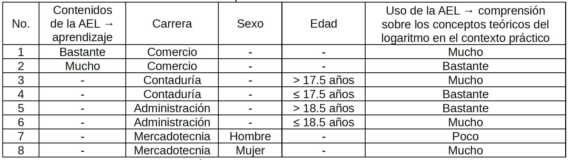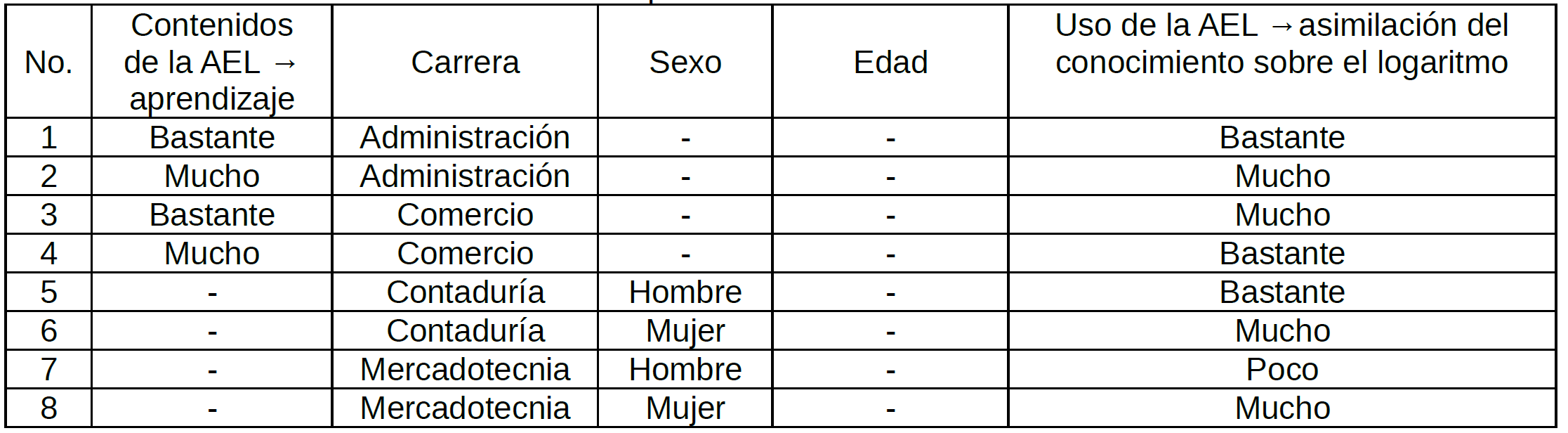 El modelo predictivo 1 tiene 4 condiciones sobre los contenidos de la AEL y la asimilación del conocimiento sobre el logaritmo. Por ejemplo, si el estudiante cursa la carrera de Comercio y considera que los contenidos de la AEL facilitan bastante el proceso de aprendizaje entonces el uso de la AEL en las actividades escolares facilita mucho la asimilación del conocimiento sobre el logaritmo (Ver Tabla 4).