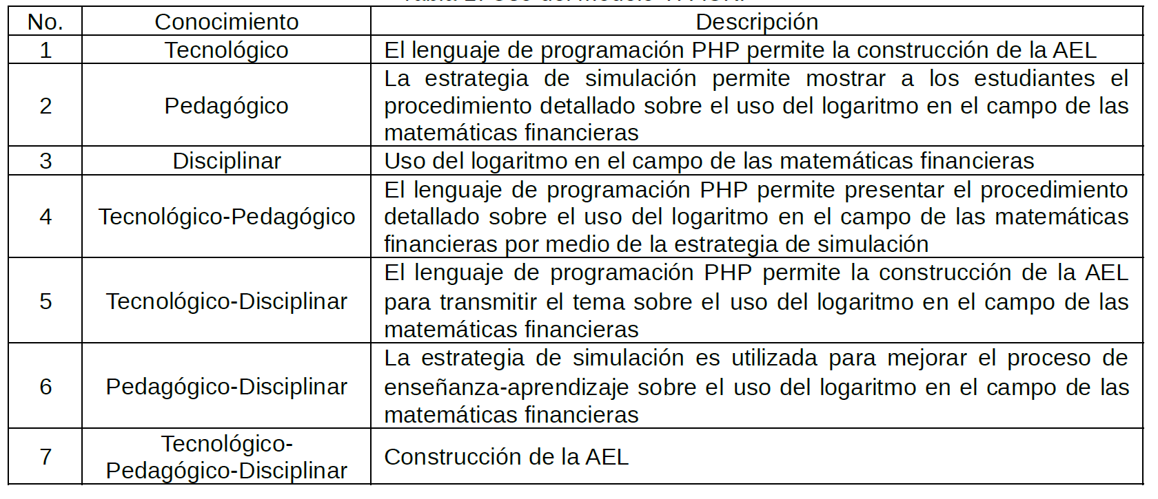 Por otro lado, el modelo TPACK facilita la planeación y organización de nuevas experiencias educativas por medio de los conocimientos tecnológico, disciplinar y pedagógico. De hecho, el lenguaje de programación PHP (conocimiento tecnológico), la estrategia de simulación (conocimiento pedagógico) y el uso del logaritmo en el campo de las matemáticas financieras (conocimiento disciplinar) permiten innovar el proceso educativo por medio de la construcción de la AEL.
