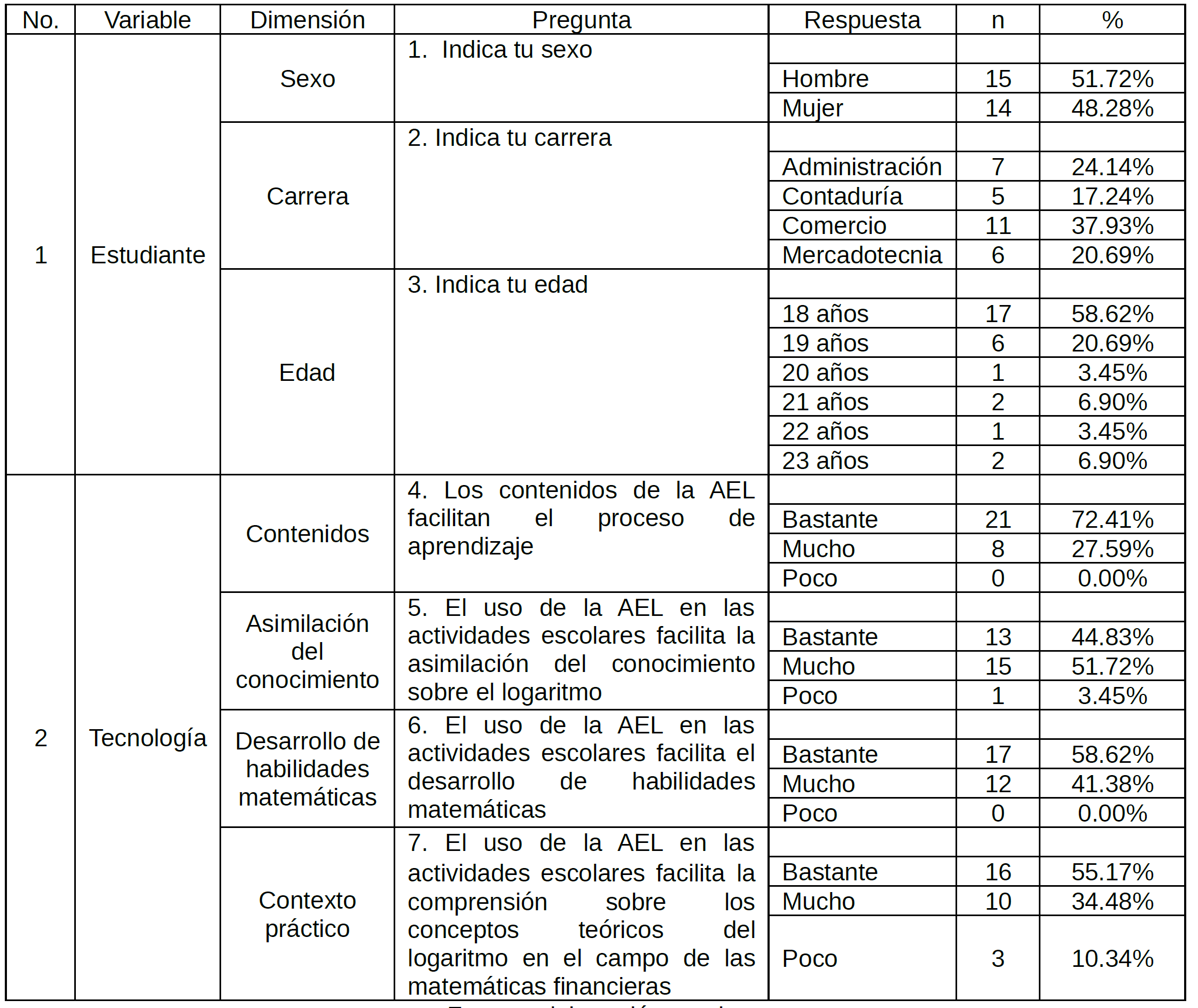El instrumento de medición está compuesto por 7 preguntas cerradas sobre el uso de la AEL en el proceso educativo (Ver Tabla 2). Este cuestionario fue aplicado al finalizar la unidad logaritmo durante el ciclo escolar 2015. Todos los alumnos de la asignatura Matemáticas Básicas contestaron el cuestionario.