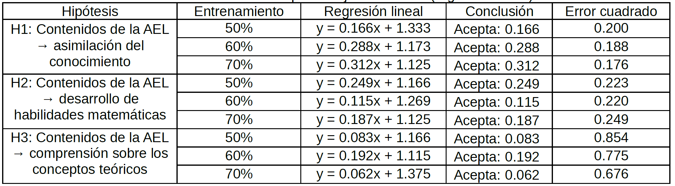 El uso de la AEL en las actividades escolares facilita bastante (n=13, 44.83%), mucho (n= 15, 51.72%) y poco (n=1, 3.45%) la asimilación del conocimiento sobre el logaritmo (Ver Tabla 2). Los resultados del aprendizaje automático con 50% (0.166), 60% (0.288) y 70% (0.312) de entrenamiento indican que la hipótesis 1 es aceptada (Ver Tabla 3). Por lo tanto, los contenidos de la AEL influyen positivamente la asimilación del conocimiento sobre el logaritmo.