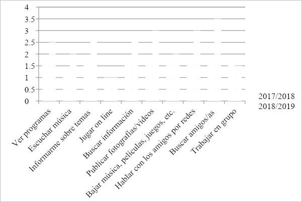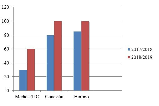 Haciendo alusión al consumo de la tecnología vemos que durante el año académico 2017/2018 un 30% poseía medios tecnológicos e internet en el domicilio habitual quedando un 70% restante sin poseer dichos medios junto a la no conexión habitual a internet y sin poseer medios tecnológicos que posibiliten dicha conexión. Del mismo modo, la conexión habitual se realizaba desde casa (80%) más de nueve horas a la semana (85%). En contraposición a la muestra estudiada del año académico 2018/2019 vemos un claro aumento en la posesión de medios tecnológicos siendo un 60% aquellas personas que poseen ordenador o tablets en casa, siendo su domicilio habitual la conexión a internet (100%) más de nueve horas a la semana (100%). En la Gráfica 2 podemos ver el contraste en relación a la utilización de la tecnología.