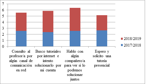 En relación al Bloque III acerca de las competencias interpersonales hemos obtenido una media total de todos los ítems de 2,55 sobre 4 durante el curso académico 2017/2018 y una media total de 3,2 sobre 4 durante el curso académico 2018/2019. En relación a cada uno de los ítems estudiados obtenemos la media más baja en el ítem “busco tutoriales por internet e intento solucionarlo por mi cuenta” con un 2,38% y al ítem “espero y solicito una tutoría presencial” la mayor puntuación con un 2,67% durante el año académico 2017/2018. En cambio, este curso académico los alumnos otorgan al ítem “hablo con algún compañero/a para ver si lo podemos solucionar juntos” la menor puntuación 3,80% y al ítem “espero y solicito una tutoría presencial” un 2,5%, siendo la mayor puntuación.