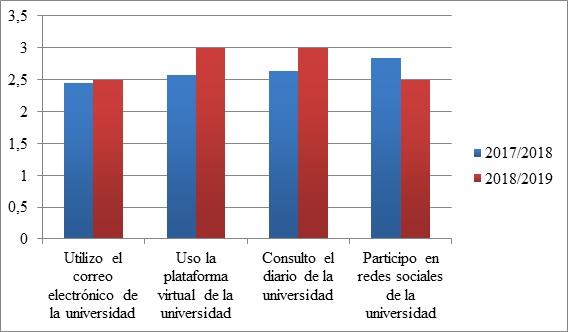 Atendiendo al último bloque hemos obtenido una media total de todos los ítems de 2,62 sobre 4 durante el curso académico 2017/2018 y una media total de 2,75 sobre 4 durante el curso académico 2018/2019. En relación a cada uno de los ítems estudiados obtenemos la media más baja en el ítem “utilizo el correo electrónico de la universidad” con un 2,5% y al ítem “participo en redes sociales de la universidad” la mayor puntuación con un 2,84% durante el año académico 2017/2018. En cambio, este curso académico los alumnos otorgan al mismo ítem “utilizo el correo electrónico de la Universidad” junto a los ítem “uso la plataforma virtual de la universidad” y “consulto el diario de la universidad” la mayor puntuación, un 3%.