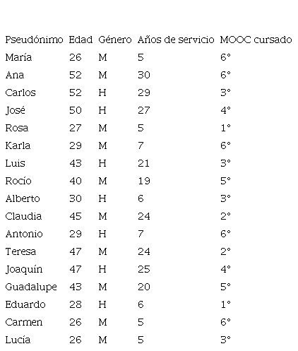Fueron considerados como participantes los docentes que cumplieran con los siguientes criterios: i) ser docente en servicio de primaria pública; ii) haber participado en alguno de los MOOC de la Colección de Aprendizajes Clave; y iii) participar de manera voluntaria en la investigación. El muestreo fue propositivo o también llamado selectivo o de juicio (MARTÍNEZ-SALGADO, 2012); supervisores y directores fungieron como informantes para facilitar su selección. El análisis de la información que se iba obteniendo ayudó a enfocar el proceso de muestreo, que continuó hasta alcanzar la saturación (NEUMAN, 2009). En total se contó con la participación de 17 profesores de la ciudad de Navojoa, Sonora, México, todos ellos egresados de Escuelas Normales, siendo estas las instituciones educativas que históricamente se han encargado de la formación inicial de docentes en el país. En la Tabla 1 se muestran las características de los participantes.