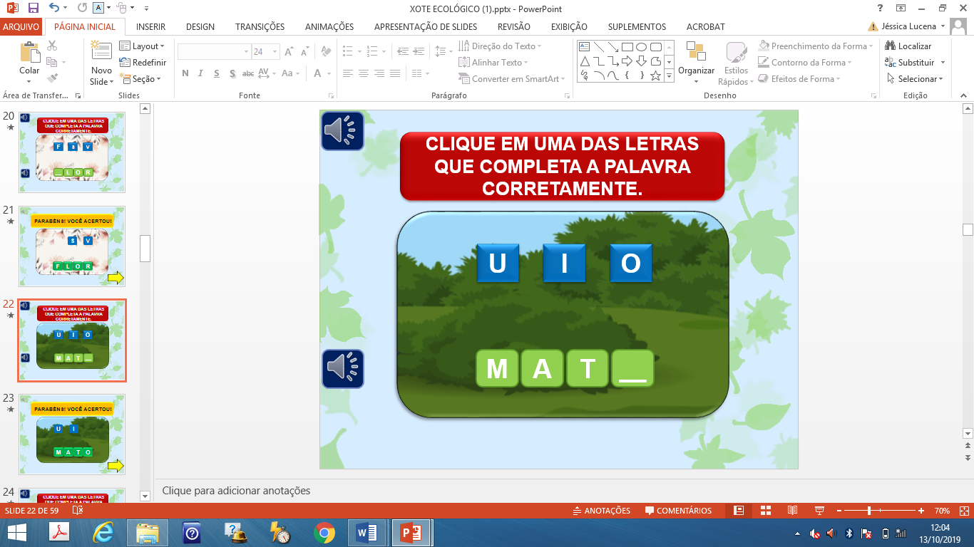 O próximo desafio é clicar na letra que completa a palavra corretamente. Na Figura 9, a palavra mato está sem sua última letra, o jogador deve clicar em uma das três opções a qual ele considera correta. Clicando nas letras incorretas, elas desaparecem, clicando na correta, a tela é direcionada ao feedback positivo, indicando que o jogador acertou e revelando a palavra por completo, como podemos ver na Figura 10.