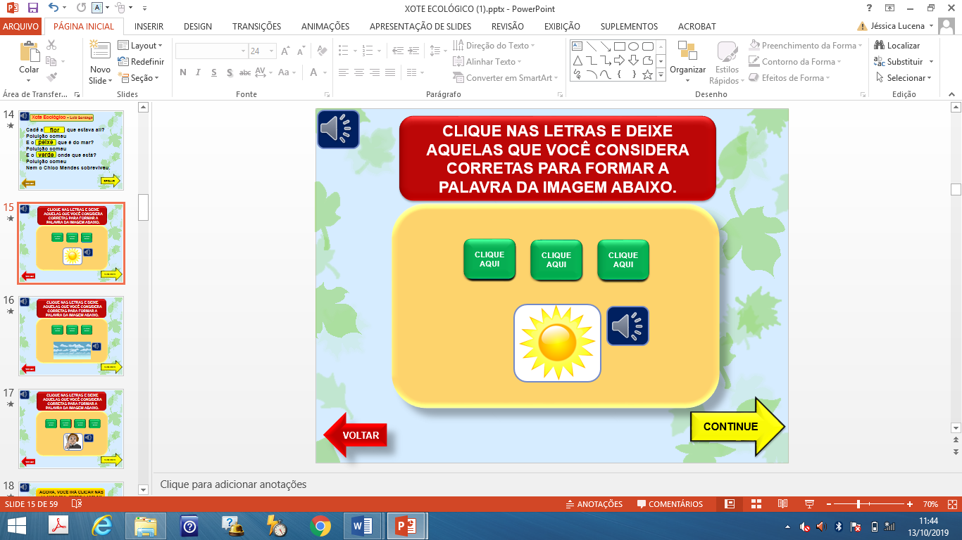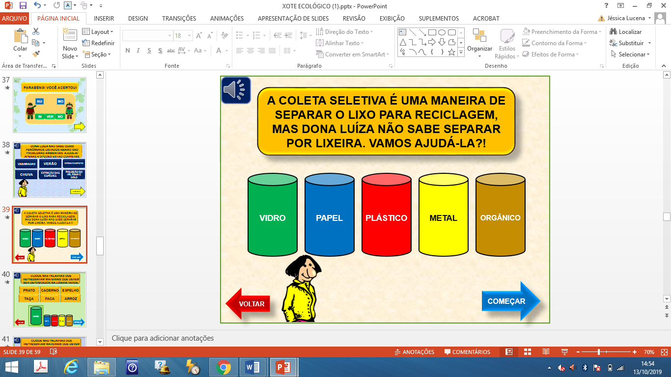 No nível seguinte (Figura 13), o desafio é clicar apenas nas palavras que representam problemas ambientais, pois Luíza não sabe identificá-los. Ao clicar nas palavras inadequadas, estas fazem um barulho de explosão e ficam na cor vermelha, em verde, indica resposta correta. O próximo desafio, na Figura 14, é mostrar para Luíza como separar o lixo de acordo com a lixeira apropriada, na coleta seletiva.