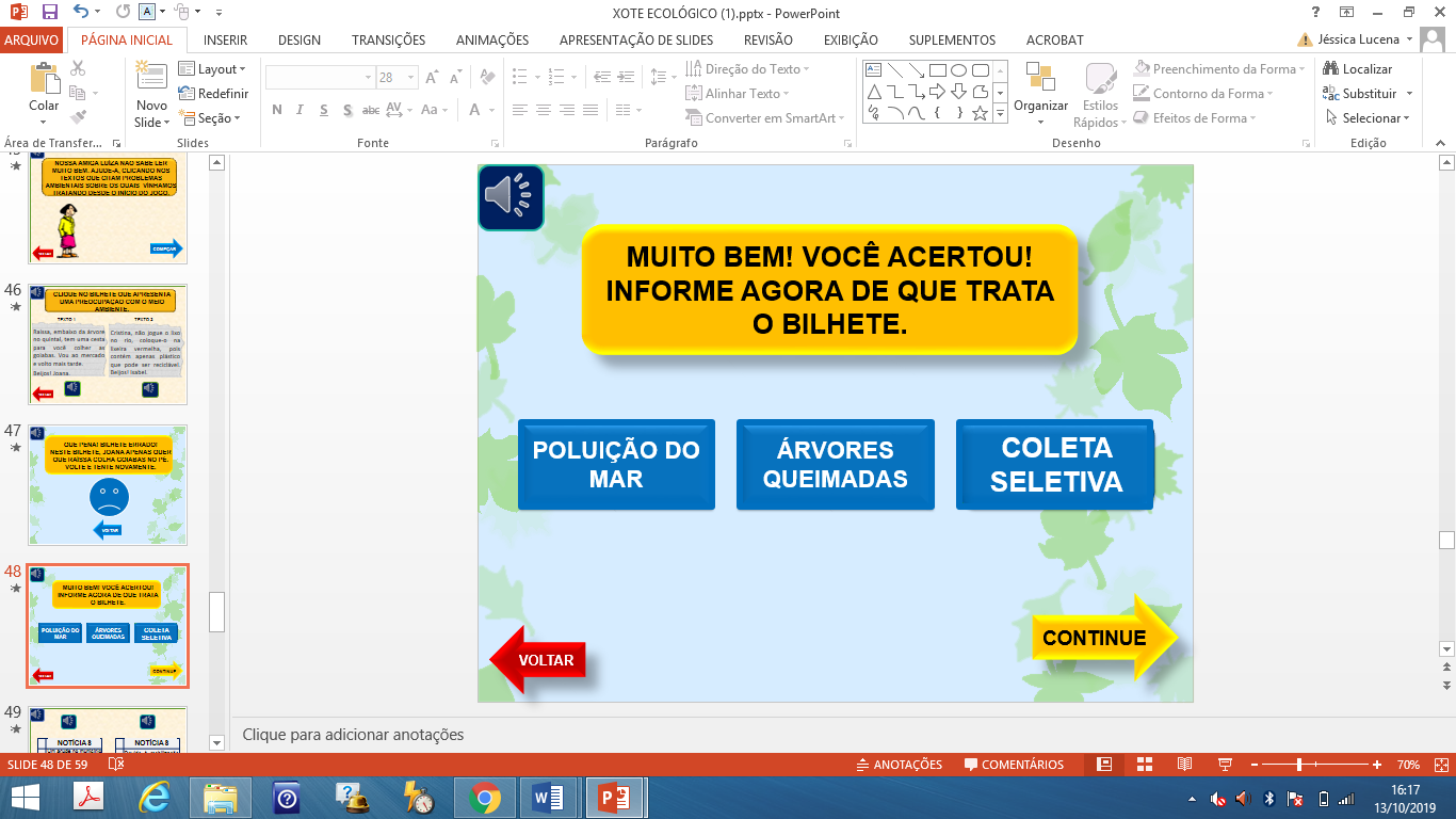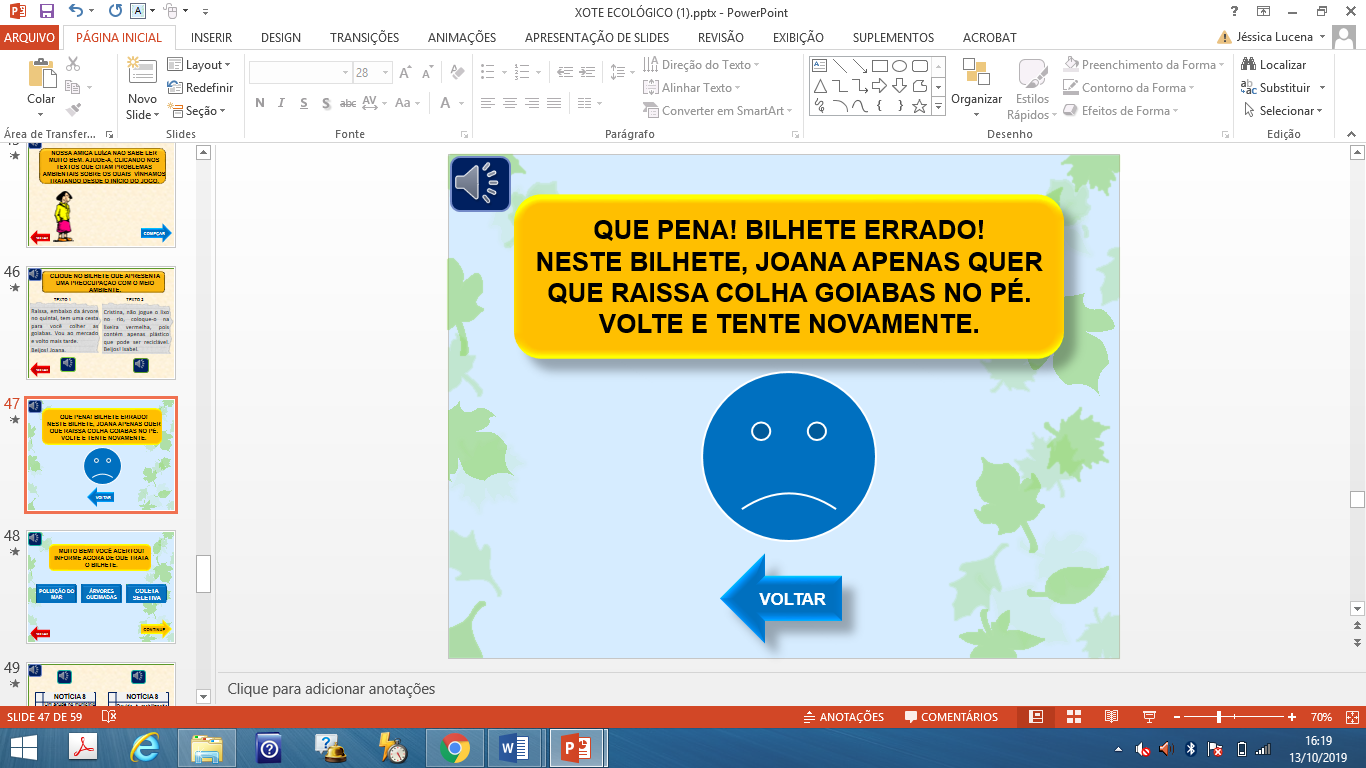 Na Figura 17, temos dois bilhetes e o jogador deve clicar no texto que apresenta preocupação com o meio ambiente. Ao errar, ele é direcionado à tela de feedback instrutivo (Figura 18), o qual descreve o motivo do erro. O jogador retorna à questão e, ao acertar a resposta, é direcionado à tela onde deve informar, dentre as três opções, o assunto tratado naquele texto (Figura 19). Se o aluno tem dificuldade em ler os textos, os áudios, abaixo de cada texto, podem ser acionados para auxiliá-lo. O jogo segue usando os mesmos procedimentos com os outros gêneros.