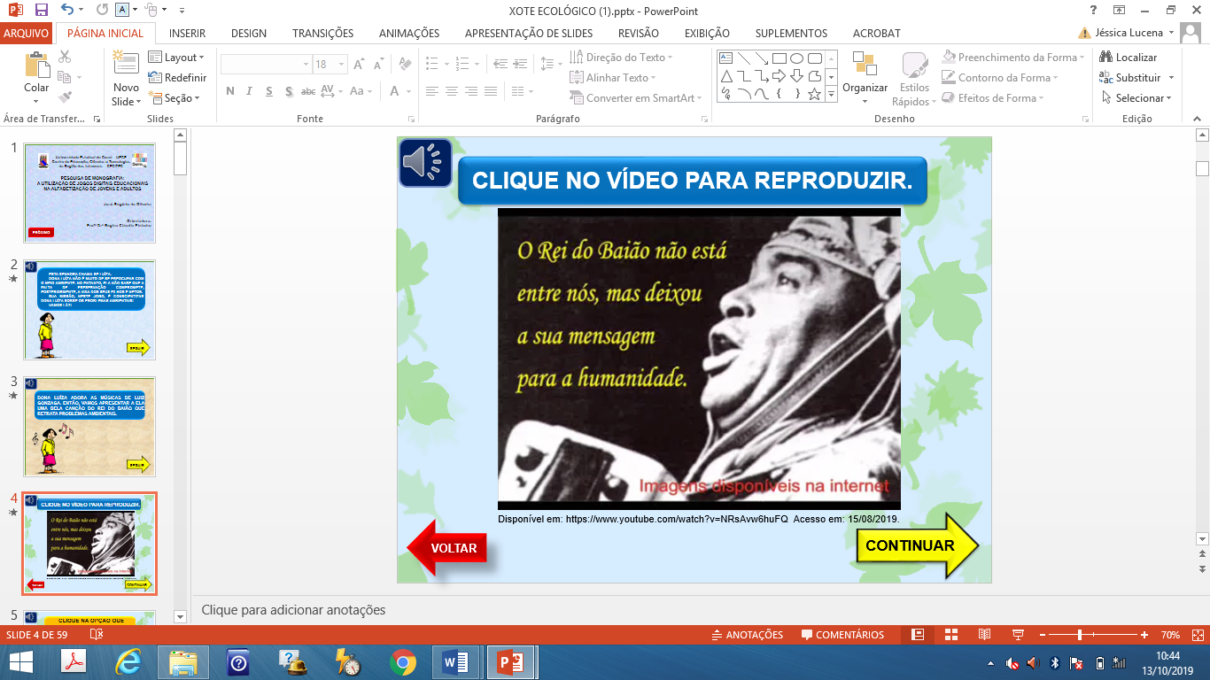 Na Figura 2, apresentamos a personagem Luíza, uma senhora que desconhece os problemas ambientais e as formas de preservação, e a narrativa do jogo, a qual apresenta a missão do jogo, que consiste em conscientizar Luíza sobre questões ambientais. Na Figura 3, está um vídeo com a canção Xote Ecológico, de Luiz Gonzaga, como podemos perceber nas Figuras 2 e 3:
