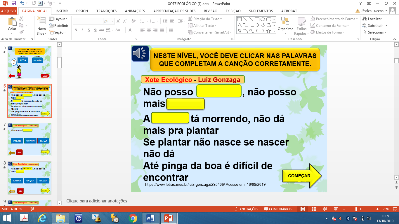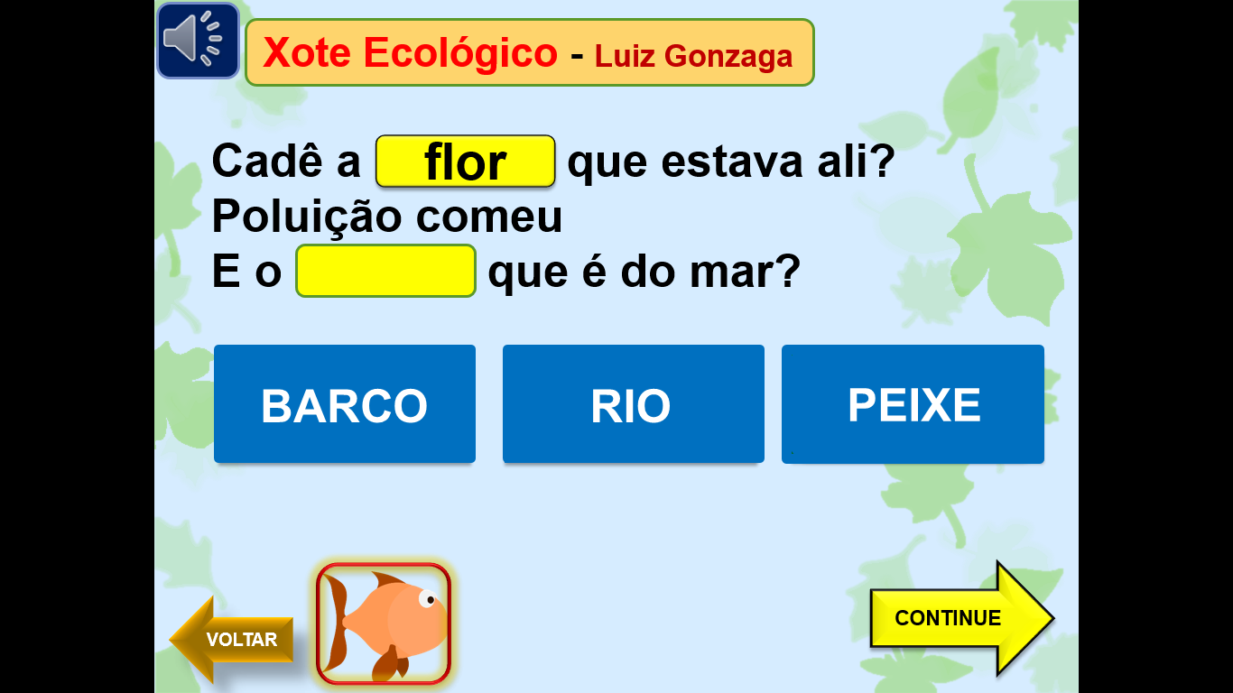 A partir da conversa que tivemos com os participantes da pesquisa, criamos um jogo que focasse em questões ambientais. Além disso, para criar o jogo digital educacional, com base no estudo teórico feito na seção anterior, escolhemos a canção Xote Ecológico que servirá como base para contextualização do estudo. Selecionamos esta música porque ela apresenta várias consequências da poluição do ar, da água e do solo para nossas vidas, que limitam o uso desses recursos naturais para nossa sobrevivência, e também porque é de autoria de Luiz Gonzaga, um importante representante da música nordestina, já que o público-alvo mora no Sertão do Ceará. Para construirmos o jogo, baseamo-nos nas informações do(a) professor(a) sobre o nível de escrita dos alunos. Segundo este profissional, os níveis variavam “de alunos que estavam no processo inicial de alfabetização àqueles que já conseguiam ler textos curtos”.