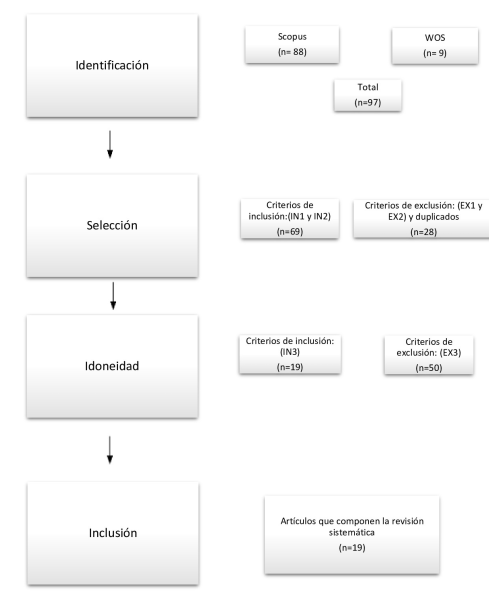 Para la recopilación de datos se siguió el protocolo PRISMA, dividiendo el proceso de discriminación en cuatro etapas (Figura 1): una primera de identificación, que contenía todos los artículos que se encuentran en las bases de datos analizadas al aplicar la ecuación de búsqueda de los dos cuadros anteriores (Cuadros 2 y 3), una segunda etapa de selección, donde se eliminaron las referencias duplicadas y las que coincidían con los criterios de exclusión (EX1 y EX2) expuestos en el Cuadro 1, una tercera fase llamada de idoneidad, en la cual se analizan los documentos para extraer los que responden a los objetivos y preguntas de investigación y los que cumplen con los criterios de inclusión (IN3), desechando el resto (EX3) y finalmente, en la etapa de inclusión se recogen los artículos que componen la muestra para esta investigación. Esta búsqueda se realizó a principios de julio de 2020 incluyendo todos los artículos indexados en las bases de datos de WoS y Scopus de todos los territorios, en los 10 últimos años.