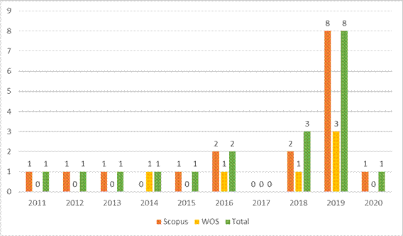 La base de datos WoS recoge 6 artículos que suponen un 31,58% del total de los artículos y Scopus 17, con el 89,47%, de los cuales 4 se encuentran en ambas bases de datos.