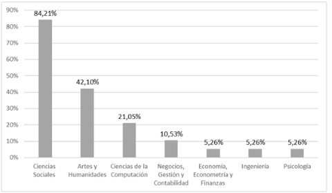 El campo del conocimiento de las Ciencias Sociales es el que más artículos recoge, con un 84,21% del total (16) que corresponde a los siguientes: McGeown et al. (2020), Jaramillo-Ponton et al. (2019), Francisco y Madrazo (2019), Prasanna-Kumara (2019), Larrañaga y Yubero (2019), Dar, Ahmad y Lone (2019), Sivasubramanian y Gomathi (2019), Singh (2019), Adi Kasuma y Ai Lin Tan (2019), Mlay y Sabi (2019), Lee (2018), Li et al. (2018), Martino Sehn y Fragoso (2015), Ljungdahl (2013), Igwesi, Chimah y Nwachukwu (2012) y Puksand (2011). Le sigue el campo de las Artes y Humanidades con 8 artículos sobre animación a lectura a través de TIC y Ciencias de la Computación con 4 (Gráfico 2).