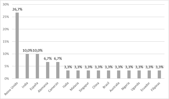 Se puede destacar que cinco instituciones pertenecientes al Reino Unido suman 8 de las 28 afiliaciones en las que se encuentran los 19 artículos estudiados, lo que supone un 28,57% del total. Le siguen la India y España con 3 instituciones distintas en cada país (Gráfico 3).