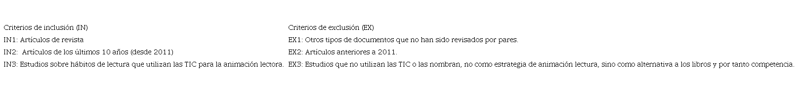 Los criterios de inclusión y exclusión, que se exponen en el Cuadro 1, se han decidido en función de los objetivos y preguntas de investigación y atendiendo a las recomendaciones de la declaración PRISMA (MOHER et al., 2009).