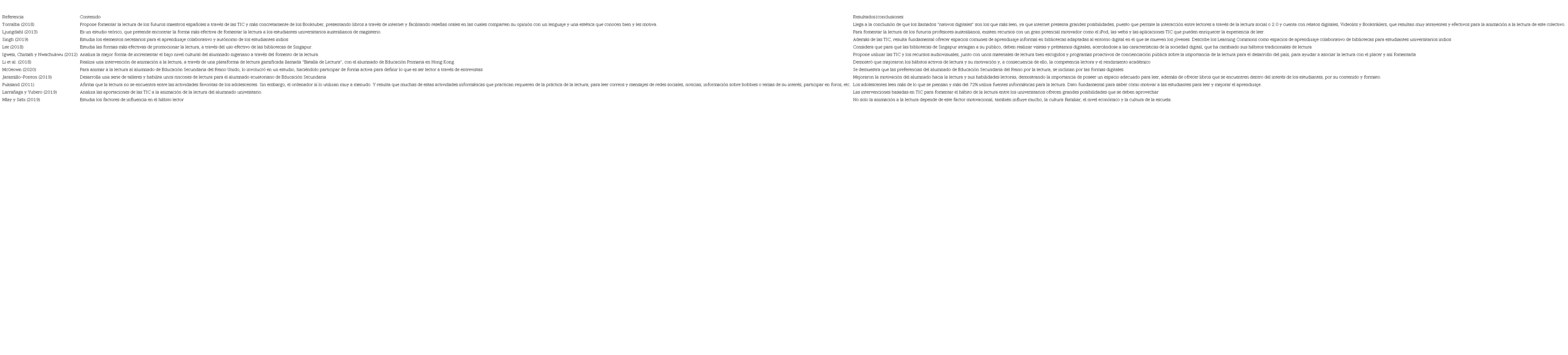El presente trabajo se ha centrado en el fomento de la lectura a través de las TIC, específicamente, siguiendo la línea de otros estudios de revisión que han analizado las TIC en educación de forma general (ALONSO-GARCÍA et al., 2019; GÓMEZ; RODRÍGUEZ; MARÍN, 2020; MARÍN-MARÍN et al., 2019).