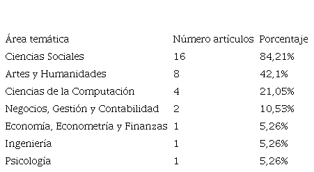 Los 17 artículos encontrados en Scopus se reparten en 7 áreas temáticas que se representan en la Tabla 1.