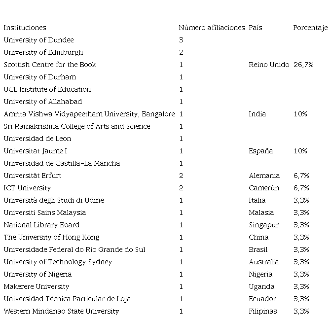 Existe una amplia variedad de instituciones, 23 en total, y países (15), repartidos por todos los continentes del mundo que han publicado artículos sobre animación a la lectura a través de TIC (Tabla 2).