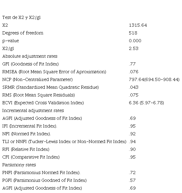 In summary: X2/gl (2.53). IAA: GFI (.77), RMSEA (.076), NCP (797.64), SRMR (.043), RMS (.075), ECVI (6.36). IAI: AGFI (.69), IFI (.95), NFI (.92), TLI/NNFI (.94), RFI (.90), CFI (.95). IP: PNFI (72.), PGFI (.57), AFGI (.69). As can be seen, the criteria for all goodness-of-fit indices are met, so the model is fully confirmed.