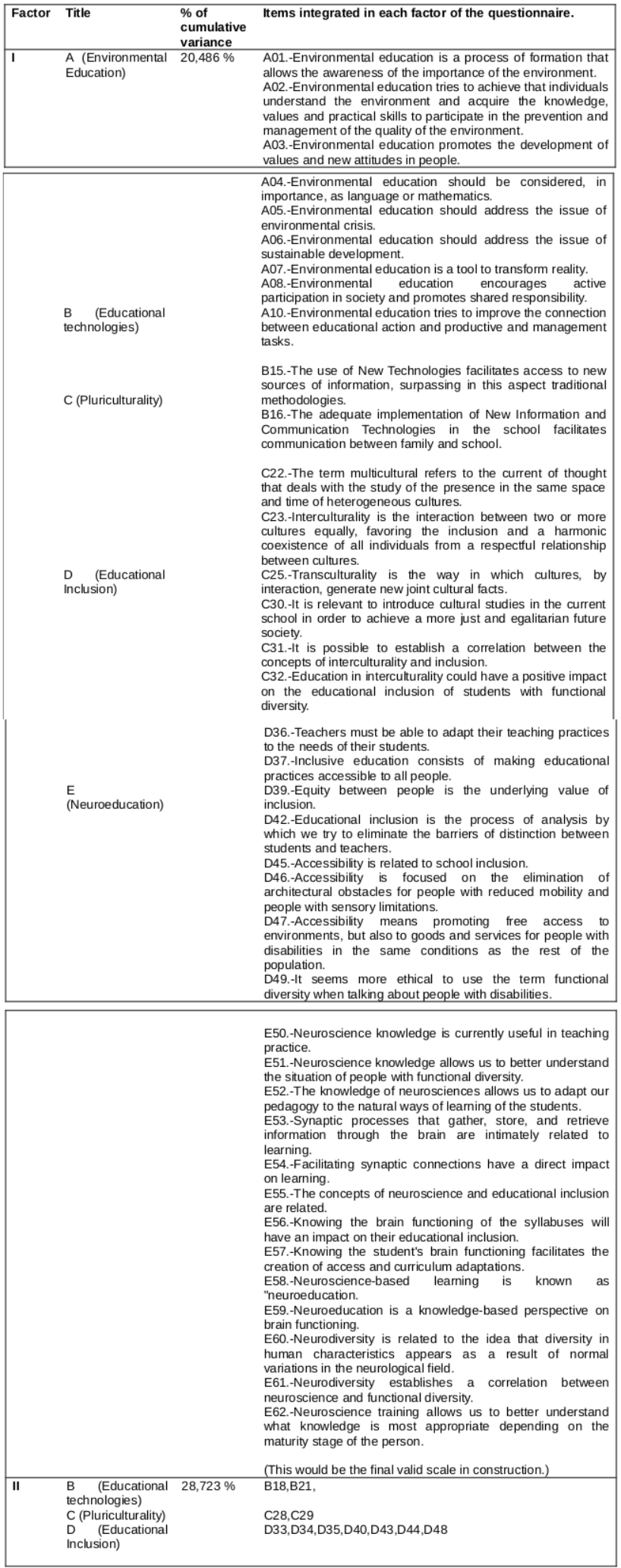 The dimensions of this study, extracted from the theoretical framework and the construction of the Likert scale are A.-Environmental education, B.-Educational technologies, C.-Pluriculturality, D.-Educational inclusion and E.-Neuroeducation. Consequently, we establish as independent variables: environmental education, educational technologies, pluriculturality, educational inclusion and neuroeducation. The dependent variables are: knowledge, perception. As an instrument we opted for a Likert scale, which was constructed with an operationalization table. Five dimensions are established, with a total of sixty-two items. The content validation was done with an expert judgment and pilot test, secondly, a factorial analysis was done to validate the scale in its construction using SPSS v25 software. The reliability analysis was performed by calculating Cronbach's alpha, giving a score of .825, which is considered good (GEORGE; MALLERY, 2003). Lisrel 8.80 was used for the structural modeling.
