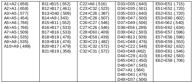 Inter-dimensional relations: A-B (.66), A-C (.58), A-D (.61), A-E (.33), B-C (.84), B-D (.91), B-E (.43), C-D (.78), C-E (.58), D-E (.67)