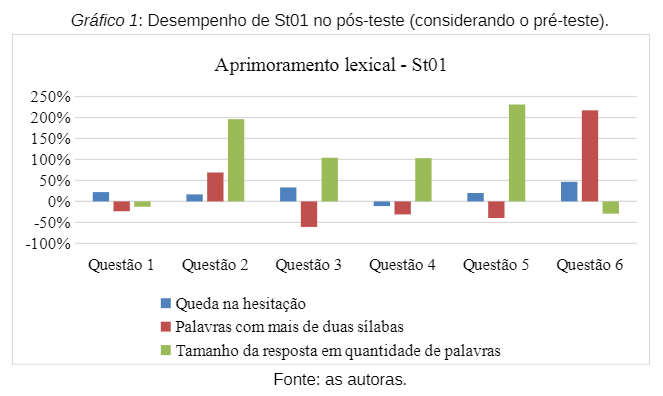 Ao analisar a performance do St01 nas respostas do pós-teste (em comparação às respostas do pré-teste), é possível notar que houve pouco avanço na queda de hesitação, declínios e melhoras no uso de palavras com mais de uma sílaba, e um aprimoramento visível no tamanho da resposta considerando a quantidade de palavras.