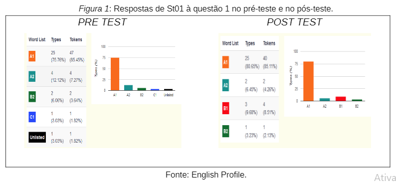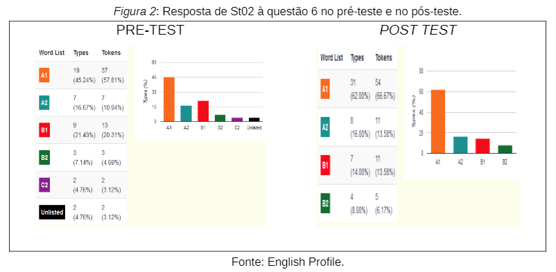 Entretanto, para além da análise feita pelo English Profile, ao nos voltarmos às perguntas e ao material de apoio (pequenos textos e áudios) e compará-los às respostas emitidas pelos alunos, constatamos que as palavras de níveis mais altos utilizadas nas respostas eram as mesmas que já haviam sido apresentadas. Essa percepção nos fez questionar os resultados obtidos.