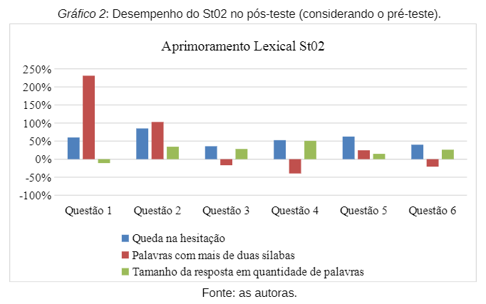 Ao analisar a performance do St02 nas respostas do pós-teste (em comparação às respostas do pré-teste), é possível notar que houve avanço na queda de hesitação, declínios e melhoras no uso de palavras com mais de uma sílaba e um leve aprimoramento no tamanho da resposta considerando a quantidade de palavras.