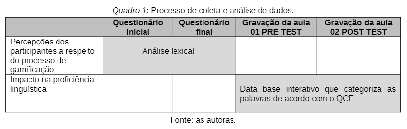 Na última aula, aplicou-se um novo questionário que buscou identificar as percepções e opiniões[9] dos estudantes acerca da metodologia utilizada no curso. O Quadro 1 a seguir retrata o processo de coleta de dados.