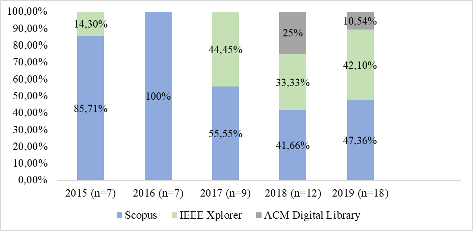 Considerando el año de producción y teniendo en cuenta que la revisión abarcó solo 2015-2019, se muestra una evolución en la publicación de artículos de la temática en cuestión. Para determinarlo, se grafica en dos direcciones. Primeramente (Figura 1) se representa el porcentaje neto de artículos, es decir, los no duplicados (si se encuentra indexados en IEEE Xplorer y Scopus o Scopus y ACM Digital Library, se asoció solo a Scopus, y si se encuentran en IEEE Xplorer y ACM Digital Library, se asumió solo a la IEEE Xplorer). En la Figura 2, se analizó desde una perspectiva singular.