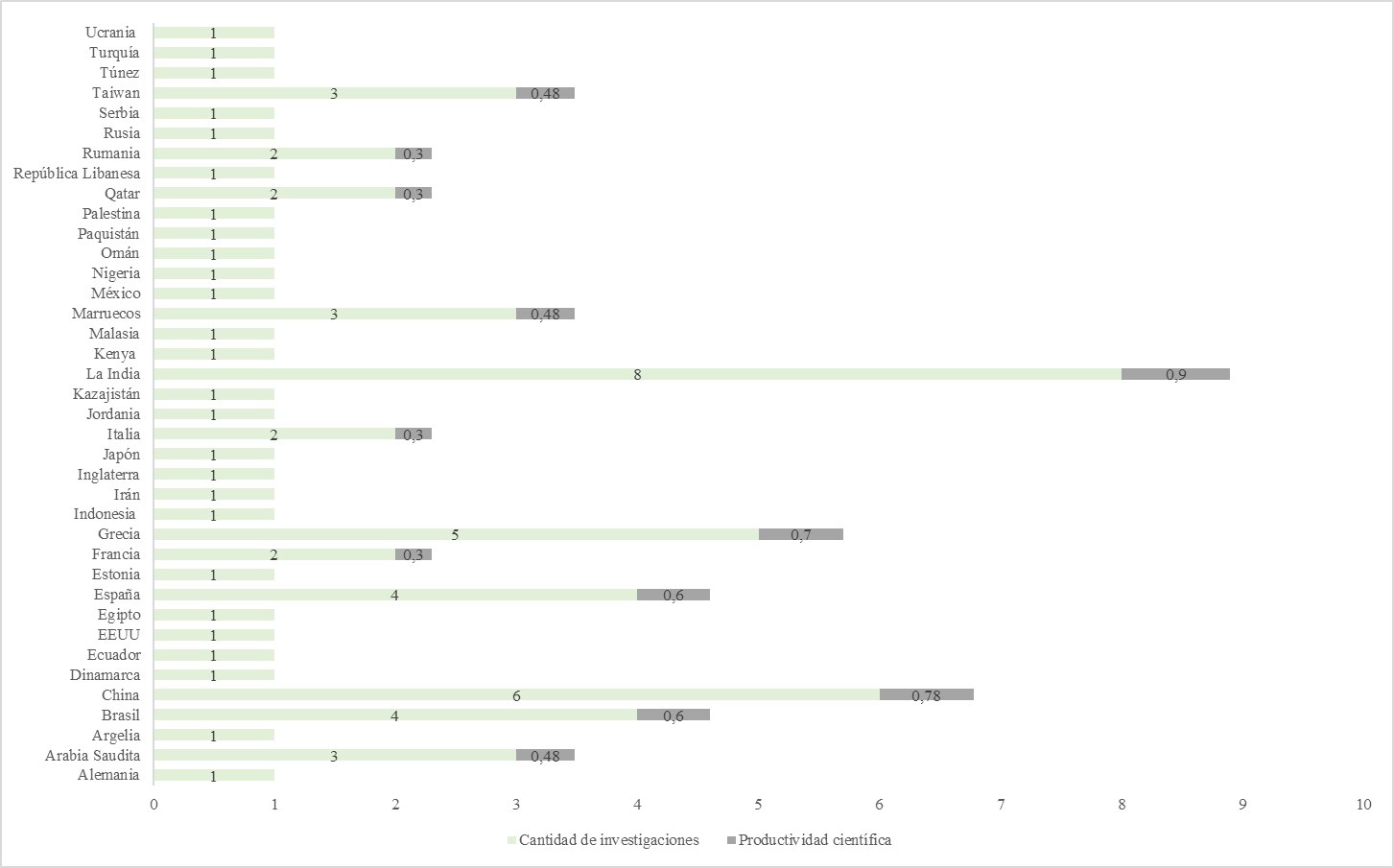 La productividad científica de los países[1] (Figura 3) evidencia que La India, China, Grecia, Brasil, España, Marruecos, Qatar, Taiwán y Rumanía, son los más destacados. Sin embargo, China, La India, España y Taiwán son los que muestran mayor cantidad de universidades por estudios realizados.