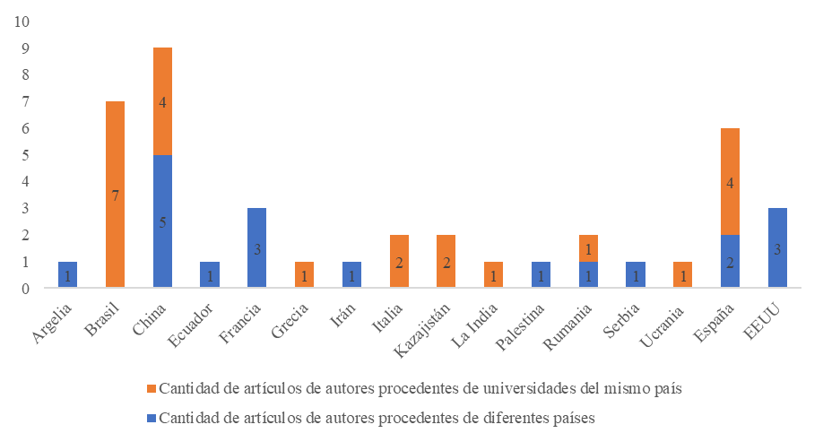 Al analizar la colaboración científica (Figura 4), China, Francia, España y EEUU, se destacan en la redacción de trabajos con autores de distintos países, mientras que Brasil, China, Italia y Kazajistán, en cuanto a la colaboración con autores procedentes de universidades del propio país. En la figura solo muestran aquellos países que muestran colaboración científica en las dos direcciones que se establecen como indicadores.