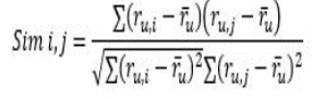 Filtrado colaborativo (CHEN; NIU; ZHAO; LI, 2012; ZHAO; NIU; WANG; NIU; LIU, 2015; TARUS; NIU; MUSTAFA, 2017): Los cálculos más comunes son K vecinos más cercanos y el “ajuste” de la similitud del coseno. La semejanza entre los dos elementos se calcula como: