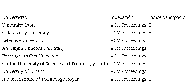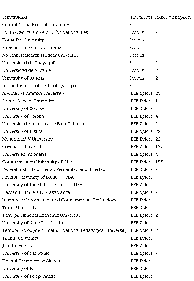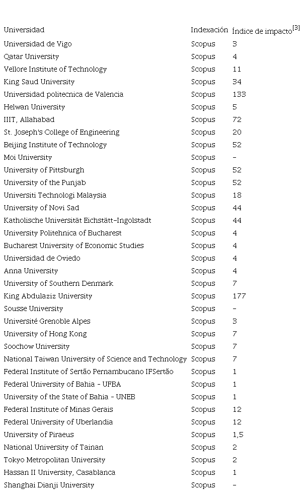 De los 19 estudios con mayor índice de impacto (n ≥11), el 73,68 % están indexados en Scopus y 26,32 % en la IEEE Xplorer, siendo la Vellore Institute of Technology, la que se destaca en cuanto a la cantidad de publicaciones. A su vez, las de mayores cantidades de citas (n ≥ 132) son: Universidad Politécnica de Valencia; King Abdulaziz University; Covenant University y Communication University of China.