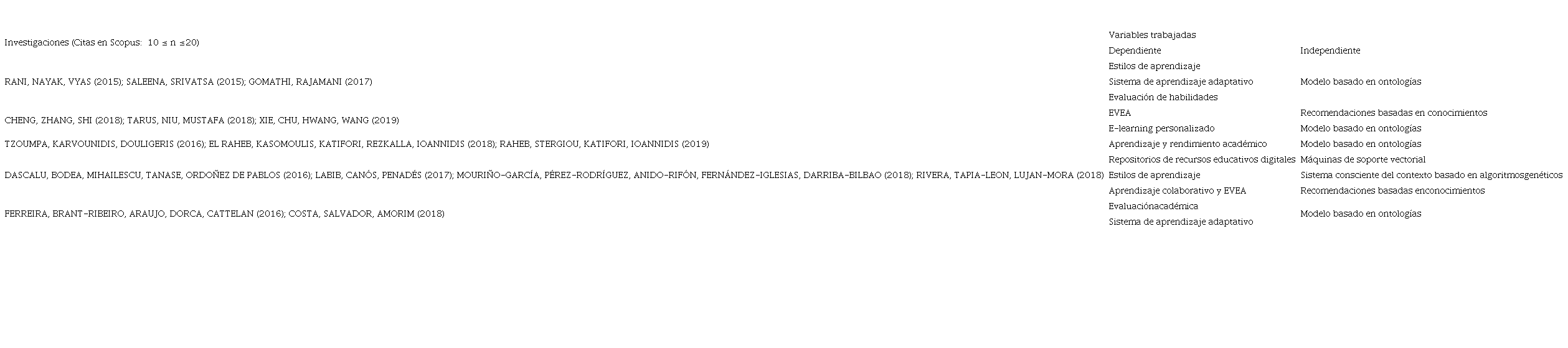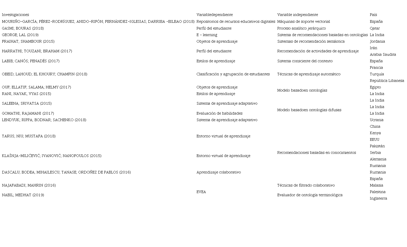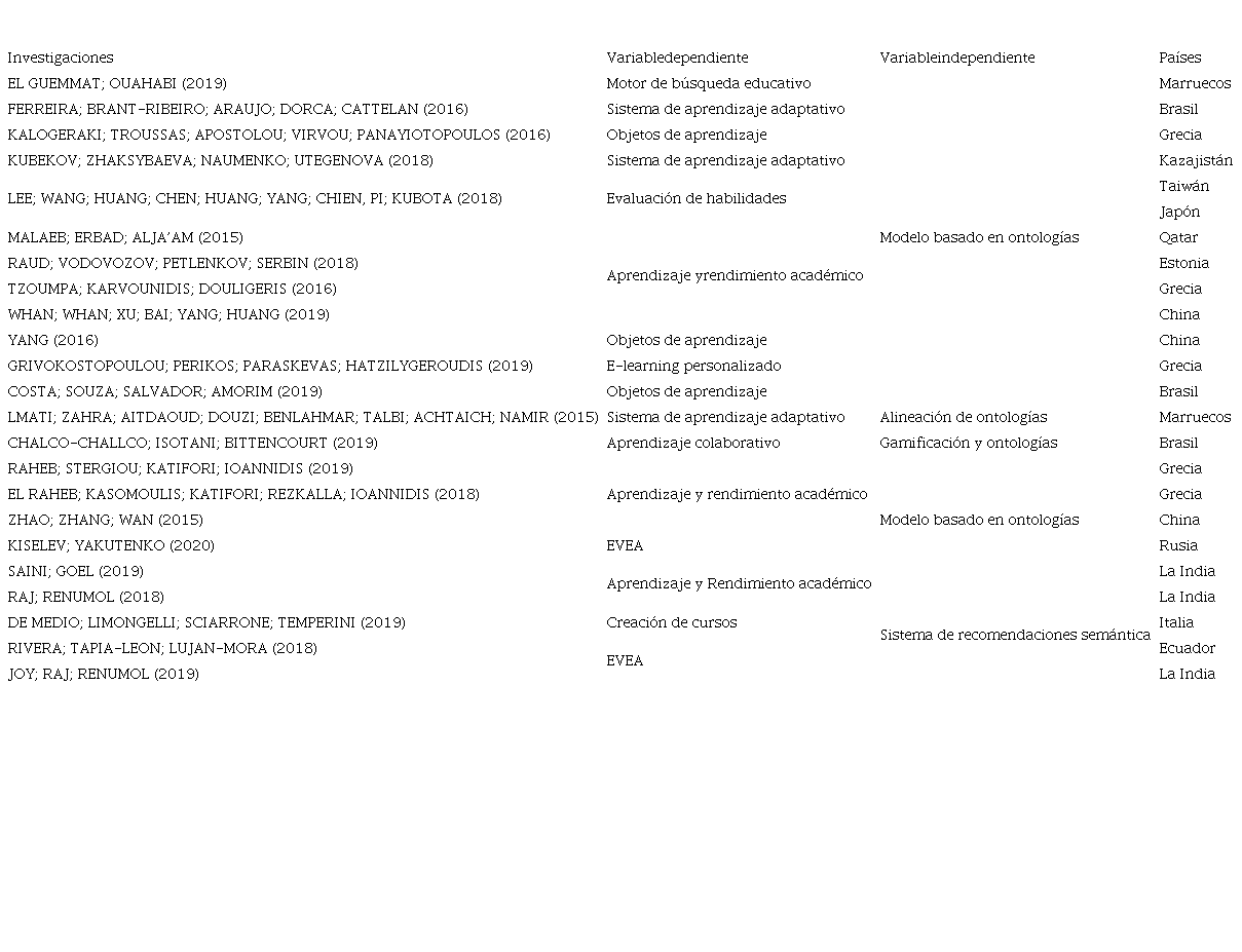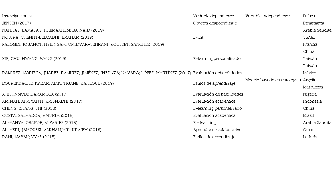 Teniendo en cuenta que el área del conocimiento de las ontologías en la educación con énfasis en el aprendizaje adaptativo, es amplio, se decidió partiendo de lo establecido en la literatura (JENSEN, 2017; TARUS; NIU; MUSTAFA, 2017; DANIEL, 2017; GEORGE; LAL, 2019; WU; DER-THANQ, 2020; XIE; CHU; HWANG; WANG, 2019; SAINI; GOEL, 2019), solo abarcar las siguientes VD: repositorios de recursos educativos digitales; perfil del estudiante; e-learning; objetos de aprendizaje; estilos de aprendizaje; clasificación y agrupación de estudiantes; evaluación de habilidades; EVEA; aprendizaje colaborativo; e-learning personalizado; evaluación académica; motor de búsqueda educativo; sistema de aprendizaje adaptativo y aprendizaje y rendimiento académico.