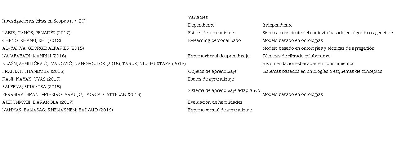 Los pares de variables VD y VI presentes en las investigaciones con mayor citación en Scopus y que mayor frecuencia absoluta obtuvieron en los 53 trabajos analizados son: VD: sistema de aprendizaje adaptativo – VI: modelo basado en ontologías difusas; VD: evaluación de habilidades – VI: modelo basado en ontologías difusas; VD: objetos de aprendizaje – VI: modelo basado en ontologías; VD: estilos de aprendizaje – VI: modelo basado en ontologías; VD: repositorios de recursos educativos digitales – VI: máquinas de soporte vectorial; VD: clasificación y agrupación de estudiantes – VI: modelo basado en ontologías; VD: EVEA – VI: Técnicas de filtrado colaborativo.